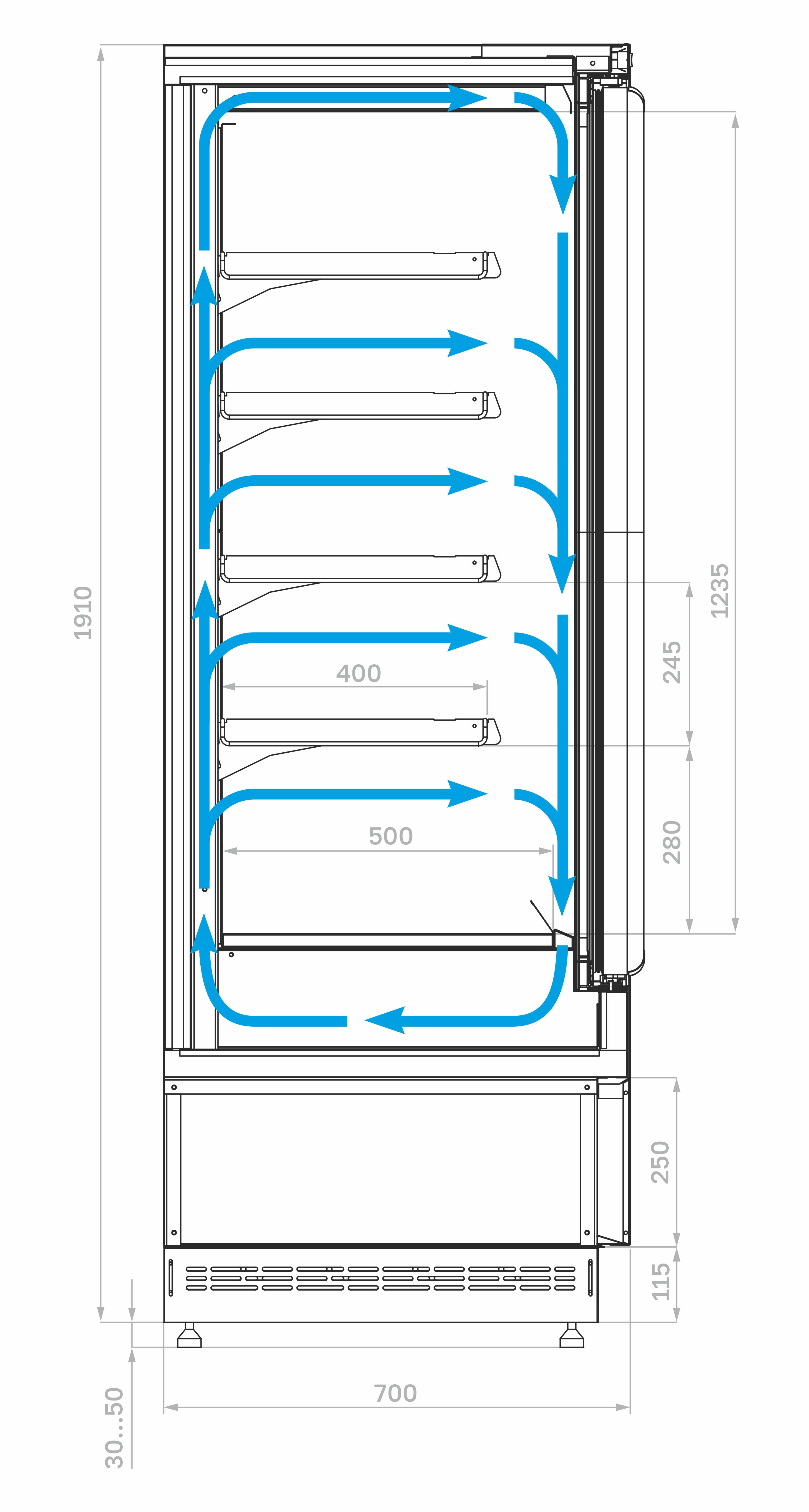 Модель оснащена четырьмя рядами навесных решетчатых полок с ограничителями, двумя распашными дверями с удобными рукоятками по всей длине створок, глухими боковинами, подставкой с фронтальной термовыводящей и цокольной решётками. Корпус выполнен из стали с антикоррозийным покрытием: внешние панели и полки окрашены в цвет нержавеющей стали (RAL 0430), а цоколь и дверные рамы — в чёрный цвет (RAL 9005). В качестве теплоизоляции используется пенополиуретан.
