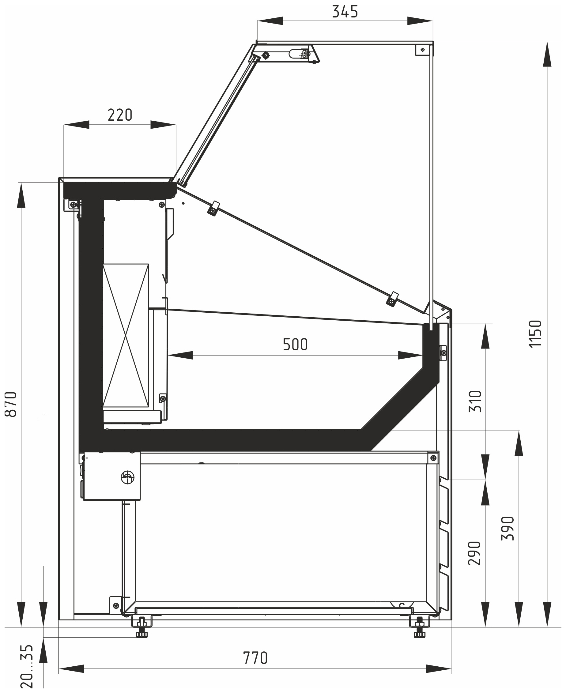Конструкция витрины включает накопитель для продуктов, поддон для выкладки и регулируемые ножки высотой 20–35 мм. Столешница, зона выкладки, боковые и нижняя фронтальная панели, а также обшивка светильника и испарителя выполнены из стали серебристого цвета. Декоративная передняя панель — из стали, держатель стекла — из нержавеющей стали. Боковины и столешница имеют пенополиуретановую теплоизоляцию.