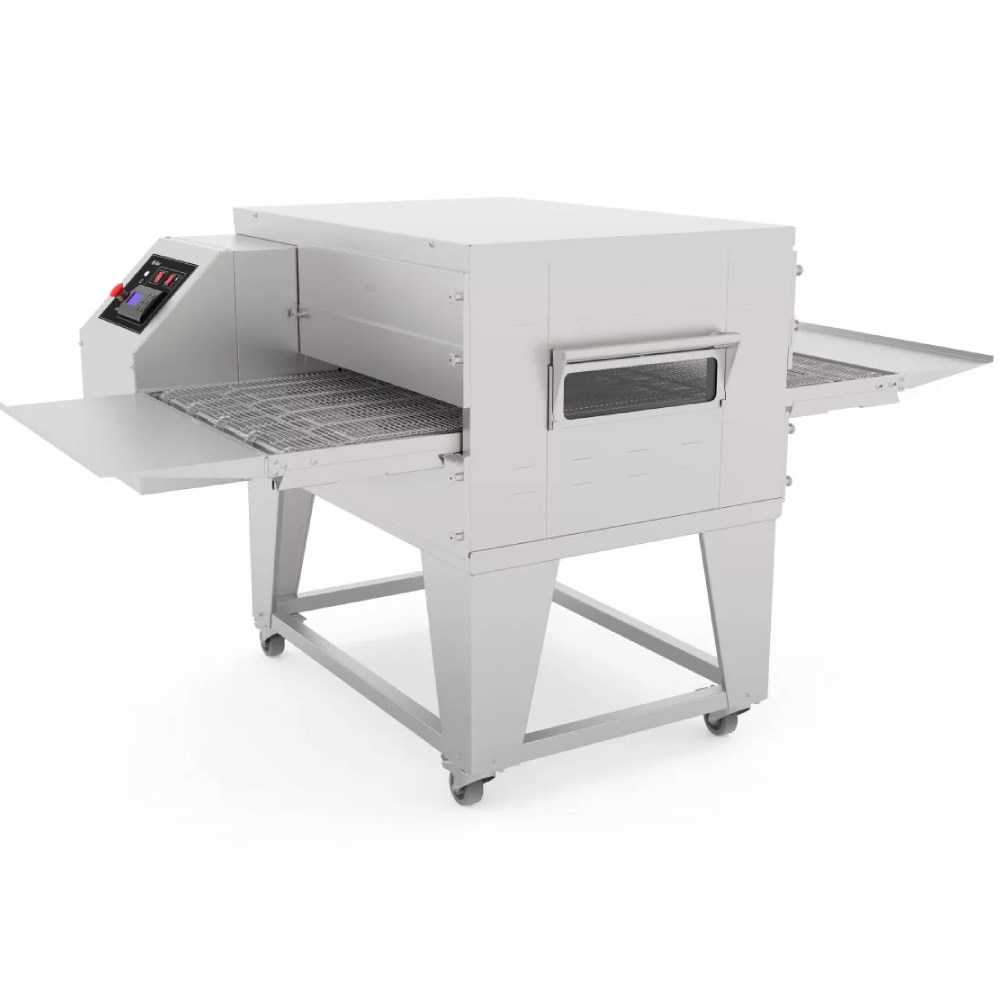 Печь оборудована прочной рабочей камерой из нержавеющей стали, что обеспечивает её долгий срок службы, устойчивость к коррозии и лёгкость в очистке. Загрузка продуктов осуществляется с обеих сторон конвейера, что позволяет упростить организацию процесса и ускоряет обслуживание. Устройство может быть установлено на комплектную подставку с регулируемыми ножками, обеспечивающими устойчивость и комфортную высоту работы.