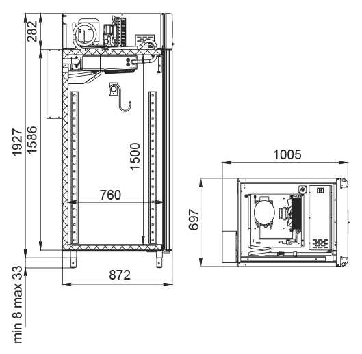 Каталог оборудования Холодильное оборудованиеШкафы холодильныеСпециализированные холодильные шкафыШкаф холодильный для вызревания мяса Polair CS107 Meat черный, со стеклом (Тип 2) Шкаф холодильный для вызревания мяса Polair CS107 Meat черный, со стеклом (Тип 2) Код товара: 062-633 Поделиться: WhatsAppTelegram СравнитьДобавить в КПВ избранное 0 392 700 ₽ В корзину 0 шт Под заказСамовывоз сегодня бесплатно Взять в кредит Купить в лизинг Получить консультацию в WhatsApp Описание Характеристики Отзывы 0 Инструкции 5 Шкаф холодильный для вызревания мяса Polair CS107 Meat черный, со стеклом (Тип 2) предназначен для создания оптимальных условий хранения и дозревания мяса на предприятиях общественного питания и торговли. Монолитный цельнозаливной корпус выполнен снаружи и на двери из окрашенной стали, внутри — из нержавеющей стали, дверь оснащена стеклопакетом. Оборудование рассчитано на работу при температуре окружающей среды до 40 °С. Особенности: Верхнее расположение агрегата для эффективного распределения холода Многофункциональная русифицированная панель управления с дисплеем диагональю 5" Возможность создания и сохранения собственных программ в памяти электронного блока Четыре перфорированные полки для удобного размещения продукции Встроенный ультразвуковой увлажнитель (требуется подключение к системе очищенной воды и централизованной канализации) UV-лампа для обеззараживания воздуха, обеспечивающая санитарную безопасность Распашная дверь с заливной теплоизоляцией и сменным уплотнителем с магнитной вставкой Встроенная удобная ручка Отключаемая внутренняя LED-подсветка Штампованное углубление в дне корпуса для удобства уборки Педаль для бесконтактного открывания двери Максимальная нагрузка на полку — 40 кг Толщина стенок корпуса — 43 мм Polair CS107 Meat черный, со стеклом (Тип 2) — это надежный и функциональный холодильный шкаф, который обеспечивает стабильные и комфортные условия для хранения и дозревания мяса. Высококачественные материалы корпуса и дверей, продвинутые системы увлажнения и обеззараживания воздуха, а также удобное управление позволяют значительно повысить качество продукции и эффективность работы предприятий пищевой отрасли.Изображение товара, представленного на фото, может отличаться от его фактического вида. Показать все Габаритные размеры697×1005×1960 ммДиапазон рабочей температурыот -2 до +30 °CДлина697 ммШирина1005 ммВысота1960 ммОбъём700 лКол-во дверей1 Тип двериСтеклянная Количество полок4 штДопустимая нагрузка на полку40 кгУровень влажностиот 60 до 95 %Холодильный агрегатВстроенный Тип оттайкиАвтоматическая Тип охлажденияДинамическое ПодсветкаЕсть UV-лампаЕсть ХладагентR290 Вес нетто160 кгВес брутто190 кгБрендPolairВсе специализированные холодильные шкафы Из нержавейкиВсе специализированные холодильные шкафы Стеклянная дверь Оставить отзыв Еще никто не оставил отзыв на этот товар Схема POLAIR CS107-Meat.jpgИнструкция на POLAIR CS107-Meat.pdfБрошюра на POLAIR CS107-Meat.pdfДекларация о соответствии.pdfСертификат соответствия.pdf Похожие товары Перейти в каталог Под заказ 207 942 ₽ Шкаф холодильный HURAKAN HKN-MA350 для созревания мяса Под заказ 390 915 ₽ Шкаф холодильный для вызревания салями Polair CS107 Salami В наличии 405 365 ₽ Шкаф холодильный для хлебопекарных производств Polair CS107 Bakery Br черный, со стеклом (Тип 2) Под заказ 169 915 ₽ Шкаф холодильный для хлебопекарных производств Polair CS107 Bak