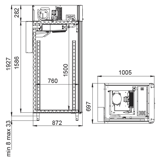 Каталог оборудования Холодильное оборудованиеШкафы холодильныеСпециализированные холодильные шкафыШкаф холодильный для вызревания салями Polair CS107 Salami со стеклом Шкаф холодильный для вызревания салями Polair CS107 Salami со стеклом Код товара: 062-631 Поделиться: WhatsAppTelegram СравнитьДобавить в КПВ избранное 0 385 050 ₽ В корзину 0 шт Под заказСамовывоз сегодня бесплатно Взять в кредит Купить в лизинг Получить консультацию в WhatsApp Описание Характеристики Отзывы 0 Инструкции 5 Шкаф холодильный для вызревания салями Polair CS107 Salami со стеклом предназначен для приготовления и хранения салями, сыровяленых колбас и других мясных деликатесов на предприятиях общественного питания и торговли. Корпус цельнозаливной конструкции выполнен из нержавеющей стали снаружи и внутри (кроме задней стенки), что обеспечивает высокую прочность и долговечность. Дверь выполнена в виде стеклопакета для удобного визуального контроля. Оборудование рассчитано на работу при температуре окружающей среды до +40 °С. Особенности: Динамическое охлаждение с мягким обдувом без заветривания Верхнее расположение агрегата Автоматическая оттайка с системой испарения конденсата Русифицированная многофункциональная панель управления с дисплеем 5" и возможностью создания и сохранения собственных программ Встроенный ультразвуковой увлажнитель (необходима подача очищенной воды и подключение к канализации) UV-лампа для обеззараживания воздуха внутри камеры 3 пары направляющих с тремя перекладинами и подвесами для колбас Регулируемый уровень влажности: от 60 до 95 % Распашная дверь с заливной теплоизоляцией, встроенной ручкой и магнитным уплотнителем Отключаемая внутренняя LED-подсветка Штампованное углубление в дне корпуса для удобства ухода Педаль для удобного открытия двери Хладагент R290 (пропан) Толщина стенки корпуса: 43 мм Polair CS107 Salami со стеклом — это профессиональный шкаф, разработанный специально для мясных деликатесов. Он обеспечивает оптимальные условия для ферментации и хранения продукции за счёт точного контроля температуры и влажности, продуманной конструкции и удобного функционала. Такой шкаф станет надёжным решением для мясных цехов, гастробаров и специализированных магазинов.Изображение товара, представленного на фото, может отличаться от его фактического вида. Показать все Габаритные размеры697×1005×1960 ммДиапазон рабочей температурыот -2 до +30 °CДлина697 ммШирина1005 ммВысота1960 ммОбъём700 лКол-во дверей1 Тип двериСтеклянная Уровень влажностиот 60 до 95 %Холодильный агрегатВстроенный Тип оттайкиАвтоматическая Тип охлажденияДинамическое ПодсветкаЕсть UV-лампаЕсть ХладагентR290 Вес нетто160 кгВес брутто190 кгБрендPolairВсе специализированные холодильные шкафы Из нержавейкиВсе специализированные холодильные шкафы Стеклянная дверь Оставить отзыв Еще никто не оставил отзыв на этот товар Схема POLAIR CS107 Salami.jpgИнструкция на POLAIR CS107 Salami.pdfБрошюра на POLAIR CS107 Salami.pdfДекларация о соответствии.pdfСертификат соответствия.pdf Похожие товары Перейти в каталог Под заказ 399 500 ₽ Шкаф холодильный для вызревания мяса Polair CS107 Meat со стеклом (Тип 1) Под заказ 419 900 ₽ Шкаф холодильный для хлебопекарных производств Polair CS107-Bakery Br со стеклом (Тип 2) Под заказ 391 000 ₽ Шкаф холодильный для вызревания сыра Polair CS107 Cheese полки нерж. Под заказ 392 700 ₽ Шкаф холодильный для вызревания мяса Polair CS107 Meat черный, со стек