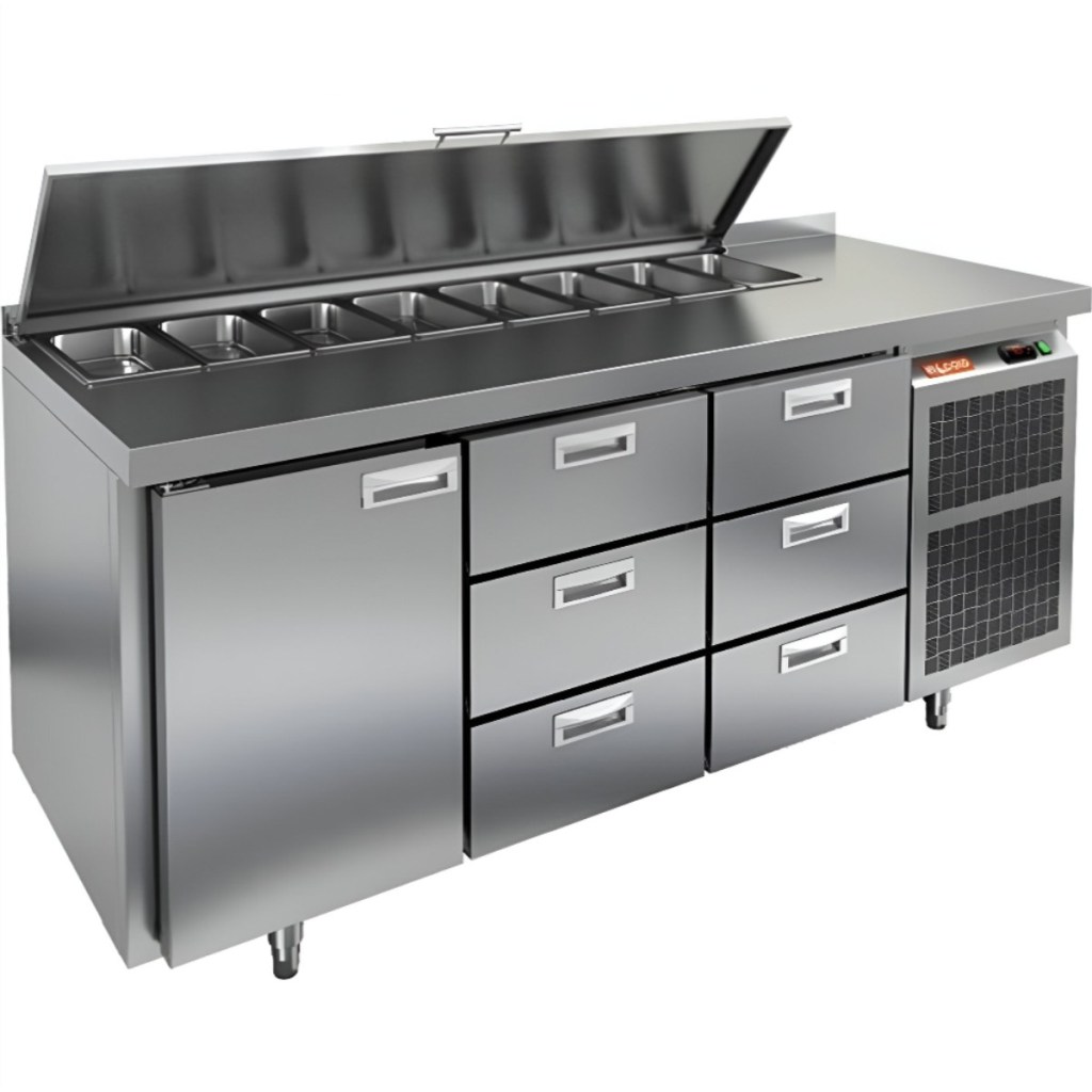 Каталог оборудования Холодильное оборудованиеСтолы охлаждаемыеСтолы холодильные для салатовСтол холодильный для салатов HiCold SL1-133GN (1/3) с крышкой Стол холодильный для салатов HiCold SL1-133GN (1/3) с крышкой Код товара: 064-848 Поделиться: WhatsAppTelegram СравнитьДобавить в КПВ избранное 0 209 962 ₽ В корзину 0 шт Под заказСамовывоз сегодня бесплатно Взять в кредит Купить в лизинг Получить консультацию в WhatsApp Описание Характеристики Отзывы 0 Стол холодильный для салатов HiCold SL1-133GN (1/3) предназначен для использования на предприятиях общественного питания и торговли. Он объединяет рабочую поверхность и охлаждаемый отсек, что делает его удобным решением для хранения, охлаждения и подготовки ингредиентов при приготовлении салатов, пиццы и других блюд. Такая конструкция позволяет повару работать быстрее и эффективнее, так как все необходимые продукты находятся под рукой. Корпус и столешница выполнены из прочной нержавеющей стали, устойчивой к коррозии и легко поддающейся санитарной обработке. Металлическая крышка защищает продукты от загрязнений и сохраняет их свежесть. Особенности модели: Электронная панель управления — точная настройка температурного режима. 1 глухая дверь — удобный доступ к холодильному отсеку. 6 выдвижных ящика — быстрое размещение и замена продуктов. Вместимость салат-бара — до 8 гастроемкостей глубиной до 100 мм. Автоматические доводчики дверей с фиксацией в открытом положении. Легкозаменяемые магнитные уплотнители — надежная герметичность. Открытая агрегатная часть — быстрый доступ для обслуживания. Регулируемые по высоте ножки — устойчивость даже на неровном полу. Толщина столешницы, борта и теплоизоляции — 50 мм, что обеспечивает прочность и энергоэффективность конструкции. HiCold SL1-133GN (1/3) — практичное и удобное решение для профессиональной кухни, обеспечивающее удобную подготовку и хранение ингредиентов. Изображение товара, представленного на фото, может отличаться от его фактического вида. Показать все Габаритные размеры1835×700×850 ммДиапазон рабочей температурыот +2 до +10 °CРасположение агрегатаБоковое Материал столешницыНержавеющая Тип столаС дверьми и ящиками Тип двериГлухая Объём505 лКоличество дверей1 штТип гастроемкостейGN 1/3 Количество ящиков6 штРазмер полки530×325 ммНапряжение220 ВМощность0,46 кВтТип охлажденияДинамическое Тип оттайкиАвтоматическая СтолешницаС бортом Габариты в упаковке2000×850×1000 ммВес нетто130 кгВес брутто185 кгБрендHicold Оставить отзыв Еще никто не оставил отзыв на этот товар Ранее просмотрено Под заказ 140 481 ₽ Стол холодильный для салатов HiCold SL2-11GN (1/6) О без крышки Под заказ 255 412 ₽ Стол холодильный для салатов HiCold SL1-222GN (1/3) О без крышки