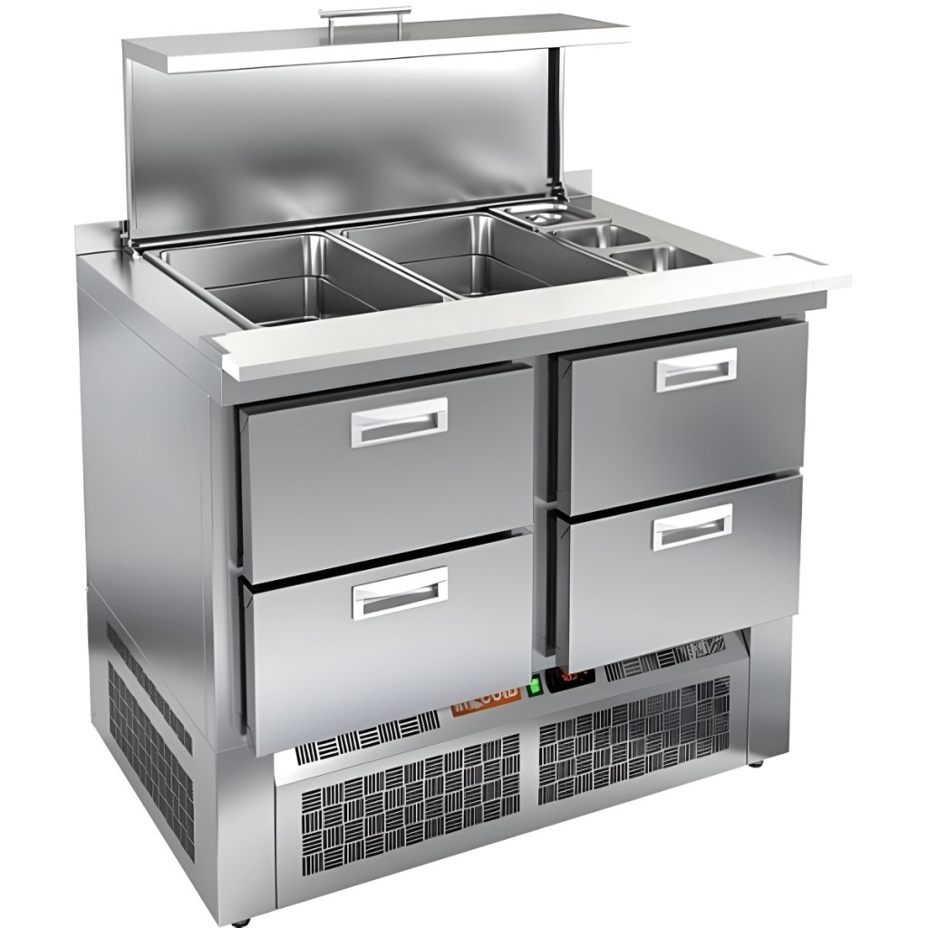 Модель обеспечивает удобный доступ к продуктам и позволяет повару работать максимально эффективно.  Корпус изготовлен из нержавеющей стали, а столешница выполнена из прочного полипропилена, что делает конструкцию гигиеничной, устойчивой к влаге и удобной для ежедневной эксплуатации. Металлическая крышка защищает продукты от загрязнений и сохраняет их свежесть.