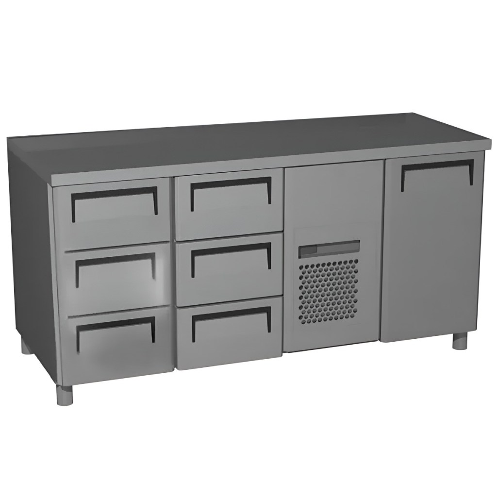Стол холодильный среднетемпературный Carboma T70 M3-1 (3GN/NT Carboma) без борта (0430-1 корпус нерж 1 дверь, 6 ящ) — профессиональное оборудование для предприятий общественного питания и торговли. Предназначен для раскатки теста, подготовки ингредиентов, охлаждения и кратковременного хранения скоропортящихся продуктов и напитков. Модель оснащена 1 дверцей и 6 выдвижными ящиками, а ножки регулируются по высоте от 90 до 110 мм.