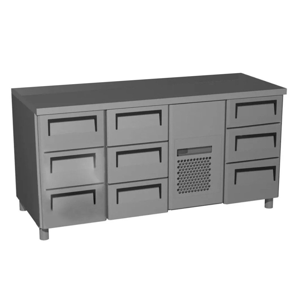 Стол холодильный среднетемпературный Carboma T70 M3-1 (3GN/NT Carboma) без борта (0430-1 корпус нерж 9 ящ) — профессиональное оборудование для предприятий общественного питания и торговли. Предназначен для раскатки теста, подготовки ингредиентов, охлаждения и кратковременного хранения скоропортящихся продуктов и напитков. Модель оснащена 9 выдвижными ящиками, а ножки регулируются по высоте от 90 до 110 мм.