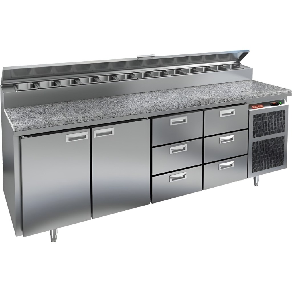 Каталог оборудования Холодильное оборудованиеСтолы охлаждаемыеСтолы холодильные для пиццыСтол холодильный для пиццы HiCold PZ2-1133GN (1/6) камень Стол холодильный для пиццы HiCold PZ2-1133GN (1/6) камень Код товара: 064-760 Поделиться: WhatsAppTelegram СравнитьДобавить в КПВ избранное 0 381 862 ₽ В корзину 0 шт Под заказСамовывоз сегодня бесплатно Взять в кредит Купить в лизинг Получить консультацию в WhatsApp Описание Характеристики Отзывы 0 Стол холодильный для пиццы HiCold PZ2-1133/GN (1/6) камень предназначен для кухонь и предприятий общественного питания. Он используется для раскатки теста, подготовки ингредиентов для пиццы, салатов и других блюд, а также для охлаждения и кратковременного хранения скоропортящихся продуктов. Модель совмещает гранитную рабочую поверхность и охлаждаемый отсек с 2 дверьми и 6 ящиками, обеспечивая удобный доступ к ингредиентам и эффективное хранение. Особенности: Динамическая система охлаждения для равномерного поддержания температуры Автоматическая оттайка для удобного обслуживания Электронная панель управления для точной настройки параметров Вместительная внутренняя полка формата GN 1/1 (размер 530×325 мм) 2 двери и 6 вместительных ящика для хранения ингредиентов Автоматические доводчики дверей с фиксатором открытого положения Легкозаменяемые магнитные уплотнители для герметичности Открытая агрегатная часть для легкого доступа к компонентам Регулируемые по высоте ножки для устойчивости Гранитная рабочая поверхность глубиной 486 мм и толщиной 50 мм — устойчива к повреждениям, высоким температурам и царапинам Толщина теплоизоляции: 50 мм Максимальная глубина гастроемкостей: 100 мм Вместимость салат-бара: 13 гастроемкости Стол холодильный HiCold PZ2-1133/GN (1/6) камень — это надёжный и функциональный стол для пиццы. Он сочетает рабочую поверхность и охлаждаемый отсек, облегчает хранение и подготовку ингредиентов, повышает удобство работы повара и соответствует стандартам профессиональной кухни.Изображение товара, представленного на фото, может отличаться от его фактического вида. Показать все Габаритные размеры2280×700×1000 ммДиапазон рабочей температурыот +2 до +10 °CРасположение агрегатаБоковое Материал столешницыГранитная Тип столаС дверьми и ящиками Тип двериГлухая Объём660 лТип гастроемкостейGN 1/6 Количество дверей2 штКоличество ящиков6 штРазмер полки530×325 ммНапряжение220 ВМощность0,5 кВтТип охлажденияДинамическое Тип оттайкиАвтоматическая Габариты в упаковке2420×850×1080 ммВес нетто230 кгВес брутто280 кгБрендHicoldВсе холодильные столы для пиццы Hicold Оставить отзыв Еще никто не оставил отзыв на этот товар Ранее просмотрено Под заказ 338 662 ₽ Стол холодильный для пиццы HiCold PZ2-222GN (1/6) камень Под заказ 207 892 ₽ Стол холодильный для пиццы HiCold PZ1-11GN (1/3) камень Под заказ 220 042 ₽ Стол холодильный для пиццы HiCold PZE2-111/GN камень со стеклом