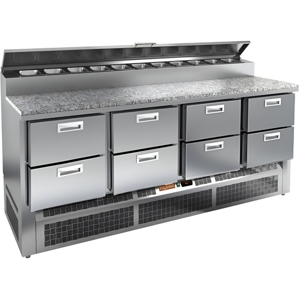 Каталог оборудования Холодильное оборудованиеСтолы охлаждаемыеСтолы холодильные для пиццыСтол холодильный для пиццы HiCold PZE2-2222/GN (1/6H) Стол холодильный для пиццы HiCold PZE2-2222/GN (1/6H) Код товара: 064-964 Поделиться: WhatsAppTelegram СравнитьДобавить в КПВ избранное 0 342 622 ₽ В корзину 0 шт Под заказСамовывоз сегодня бесплатно Взять в кредит Купить в лизинг Получить консультацию в WhatsApp Описание Характеристики Отзывы 0 Стол холодильный для пиццы HiCold PZE2-2222/GN (1/6H) предназначен для использования на предприятиях общественного питания и торговли. Он совмещает охлаждаемый объём и удобную рабочую поверхность, обеспечивая повару быстрый доступ к ингредиентам и комфорт при подготовке блюд — от пиццы и салатов до закусок и десертов. Модель отличается прочной и гигиеничной конструкцией: корпус и столешница изготовлены из нержавеющей стали, что гарантирует износостойкость и лёгкость в уходе даже при интенсивной эксплуатации. Ключевые особенности: Электронная панель управления – точная регулировка температурного режима 8 выдвижных ящиков — позволяют удобно распределить ингредиенты и оптимально организовать пространство для хранения продуктов Салат-бар на 10 гастроемкостей – удобное размещение и быстрый доступ к ингредиентам Автоматические доводчики дверей с фиксатором открытого положения – комфорт при работе Легкозаменяемые магнитные уплотнители – надёжная герметизация и простота обслуживания Открытая агрегатная часть – лёгкий доступ для технического обслуживания Регулируемые по высоте ножки – устойчивость на разных типах покрытия Максимальная глубина гастроемкостей: 100 мм Глубина рабочей поверхности: 486 мм Толщина столешницы: 50 мм Hicold PZE2-2222/GN (1/6H) — универсальный стол для пиццы, сочетающий вместительное охлаждение и рабочую поверхность из нержавеющей стали. Подходит для ресторанов, кафе и пиццерий, где важно удобство, гигиена и надёжность оборудования.Изображение товара, представленного на фото, может отличаться от его фактического вида. Показать все Габаритные размеры1970×700×990 ммДиапазон рабочей температурыот +2 до +10 °CРасположение агрегатаНижнее Материал столешницыНержавеющая Тип столаС ящиками Объём505 лТип гастроемкостейGN 1/6 Количество ящиков8 штРазмер полки530×325 ммНапряжение220 ВМощность0,46 кВтТип охлажденияДинамическое Тип оттайкиАвтоматическая СтолешницаС бортом Габариты в упаковке2200×850×1180 ммВес нетто100 кгВес брутто135 кгБрендHicold Оставить отзыв Еще никто не оставил отзыв на этот товар Ранее просмотрено Под заказ 252 712 ₽ Стол холодильный для пиццы HiCold PZE2-1111/GN камень