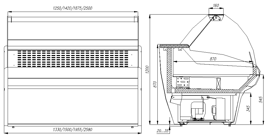 Carboma G110 VV 1,25-1 без боковин (ВХСр-1,25ш Carboma G110 (динамика)) — функциональная холодильная витрина с удобным доступом к продуктам, энергоэффективным управлением и возможностью индивидуального исполнения, идеально подходящая для предприятий общепита и торговли.